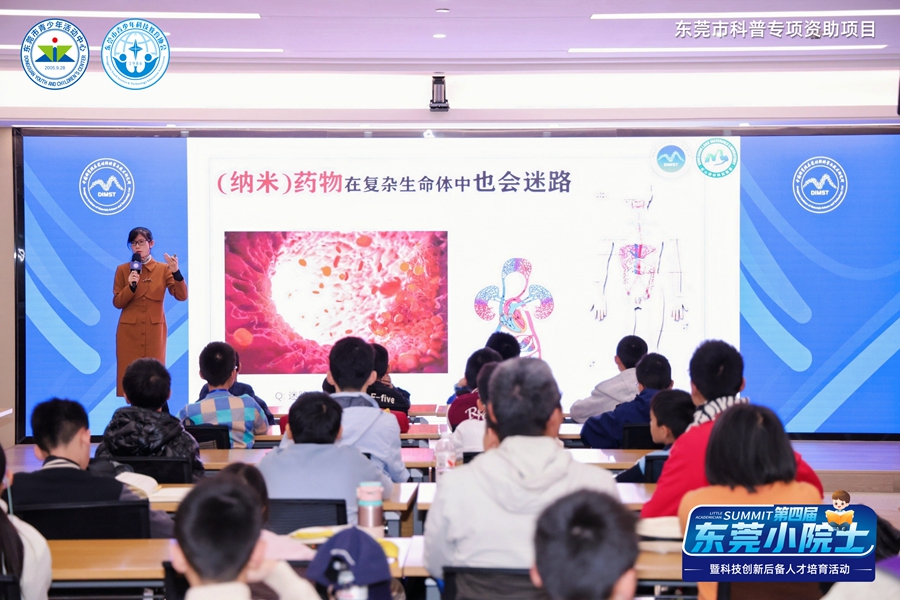 在中国科学院东莞材料科学与技术研究所,元冰研究员以《给纳米药物装上GPS:靶向递送与精准医疗》为题,用布洛芬止痛原理、洗洁精清洁原理作类比,将深奥的生物医学知识通俗化,启迪学子科学思维。