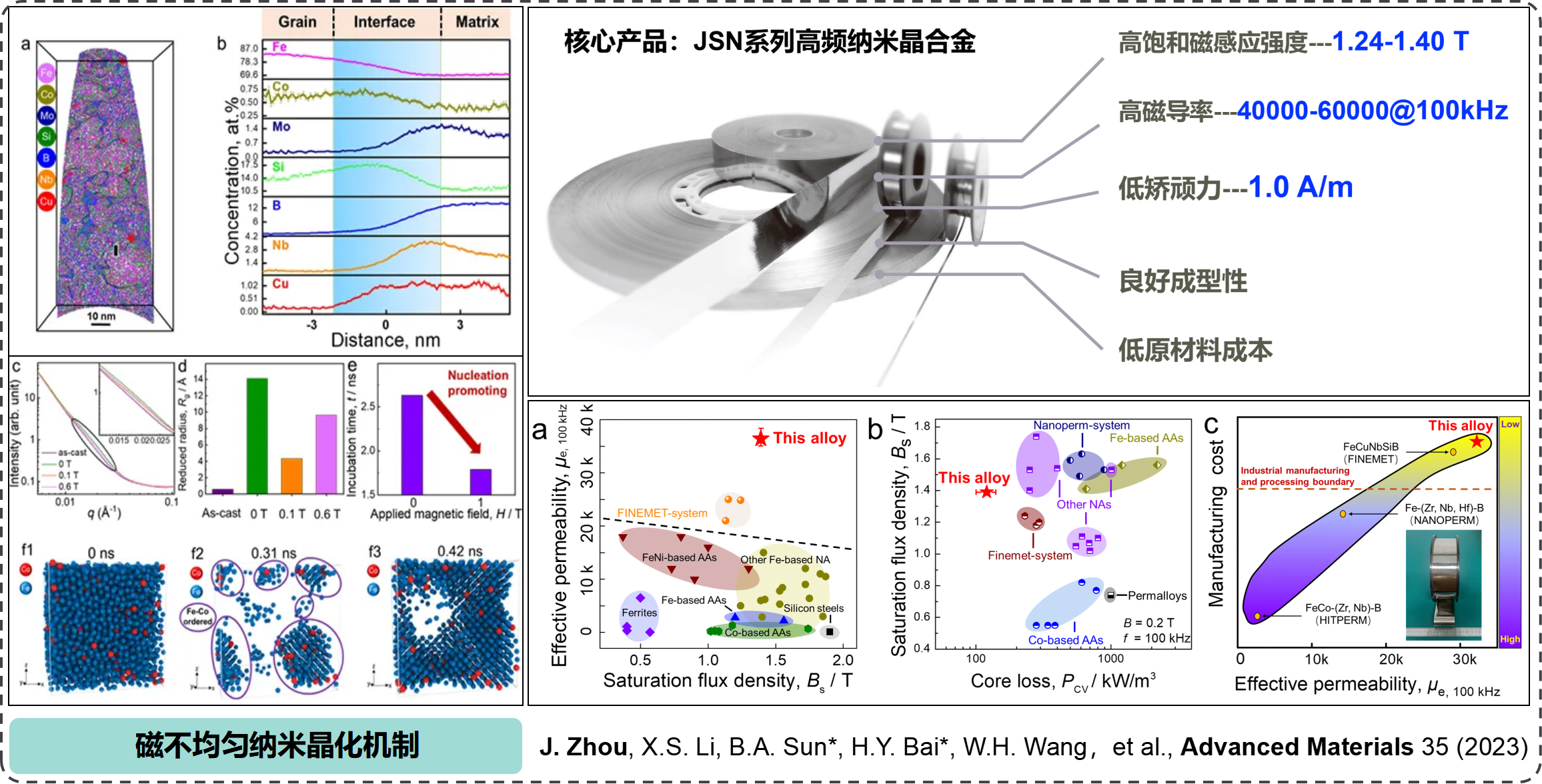团队还将进一步拓展非晶材料在新兴产业、未来产业的示范应用:推动JSN系列高频纳米晶软磁合金在高铁牵引系统、AI超算中心电源模块等国家战略领域,以及高性能非晶纳米晶软磁粉末在芯片电感、原子制造、高端涂层等前沿领域的核心技术攻关与成果应用,全面提升我国在高端软磁材料领域的核心竞争力。